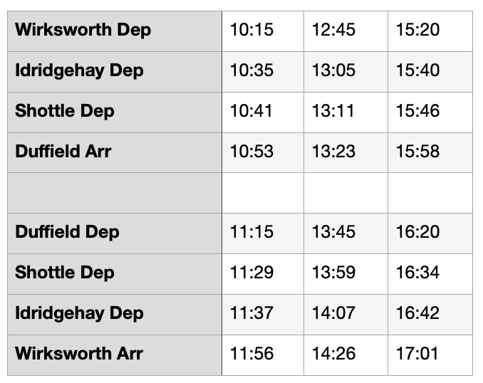 Please also refer to our calendar for services to Ravenstor Station and the monthly Duffield Shopper Special; on our What’s On page there are details of forthcoming special events.